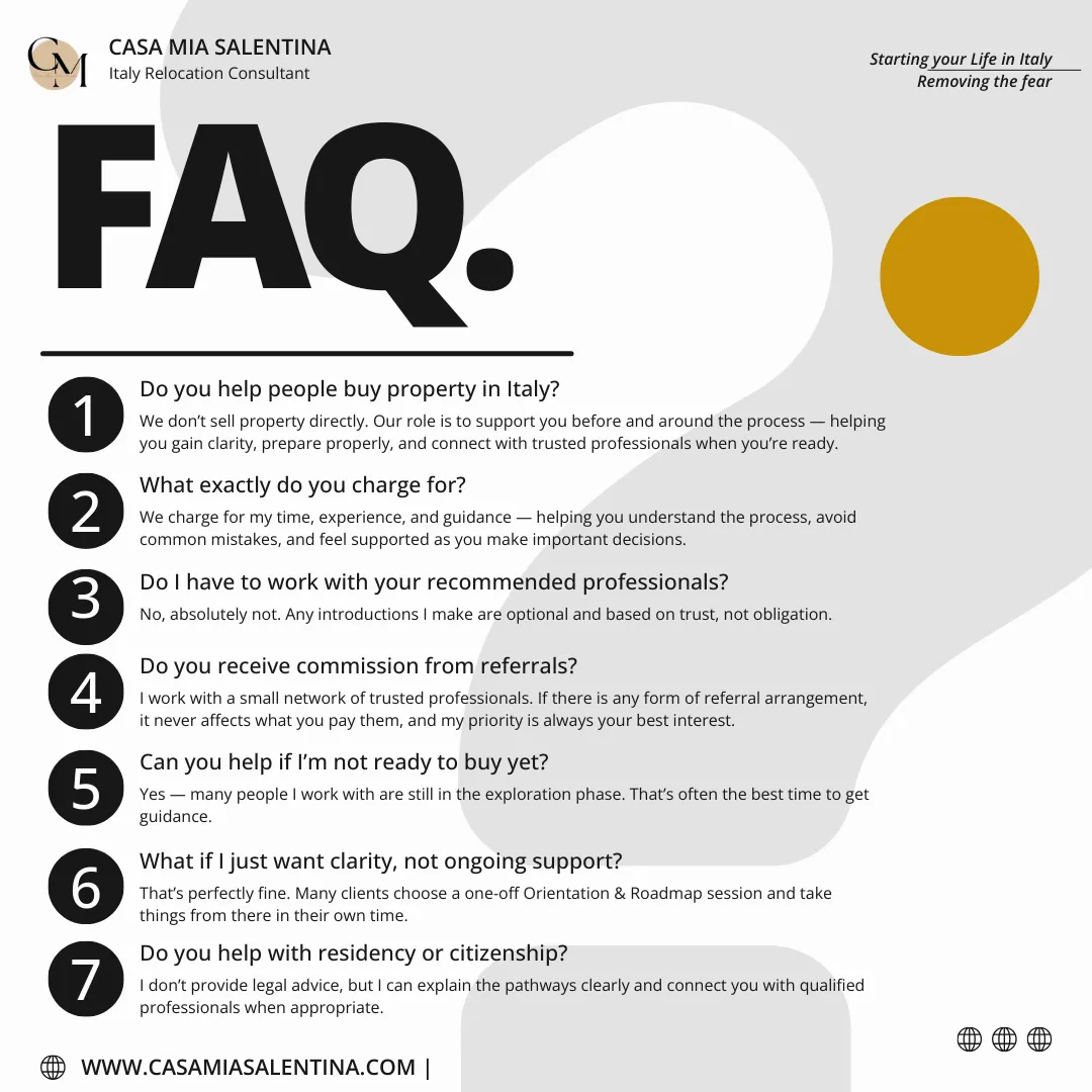 We help people move to Italy with clarity and confidence, turning what feels overwhelming into a grounded, supported next step.